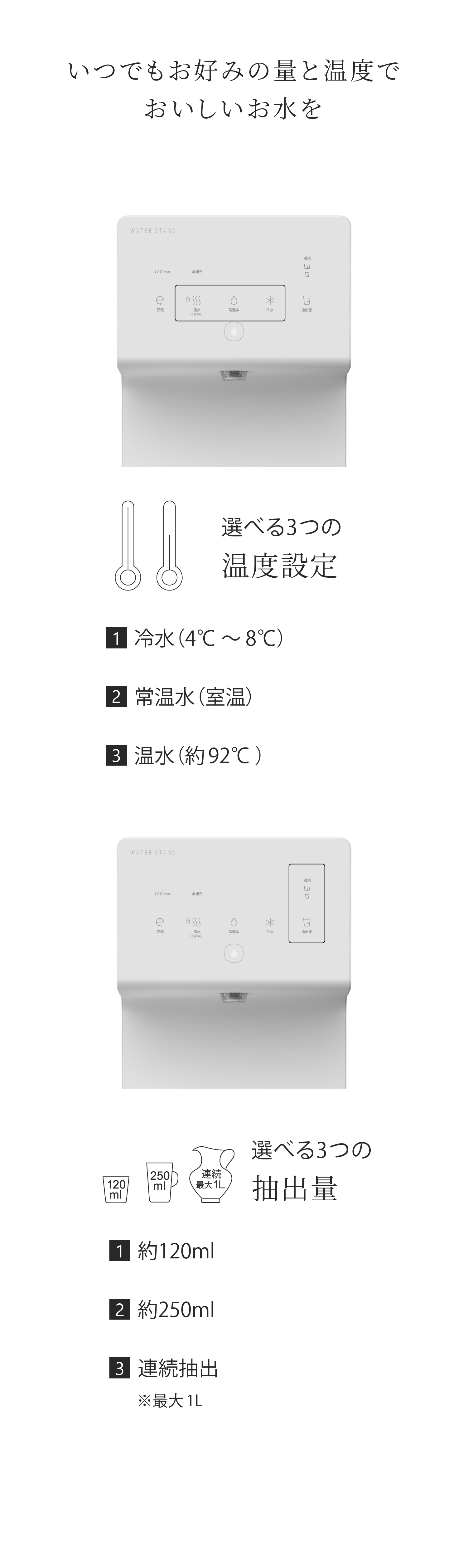 給水タンクは2~3日に一度、清潔なスポンジを使用して中性洗剤でのお手入れをお願いしております。 - 抽出量は3段階(約120ml、約250ml、最大1L)で固定ですか?抽出を途中で止めることは可能ですか?