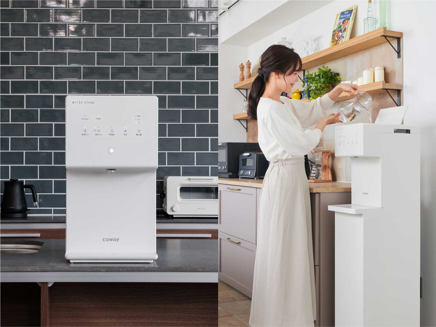 ウォータースタンドの給水型「ピュアライフシリーズ」は、ライフスタイルに合わせ2つのタイプから選べます。