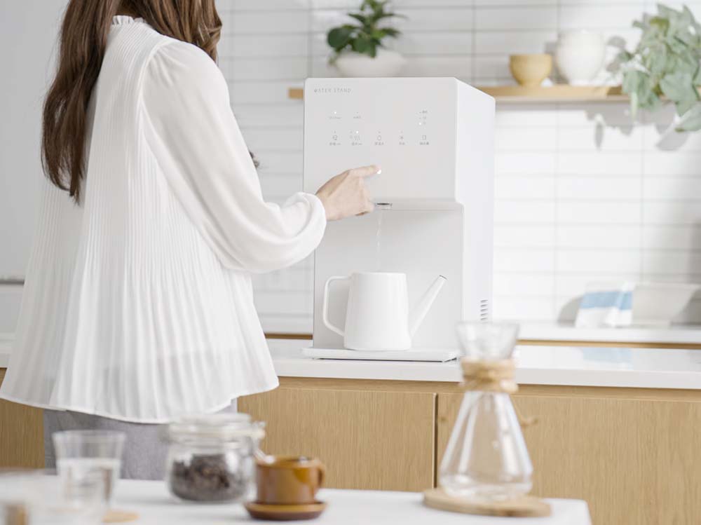 浄水型ウォーターサーバー「ウォータースタンド」は、水道から自動で給水する「水道直結型」があるため、手動で補充するタイプを「給水型」と呼んで区別しています。
